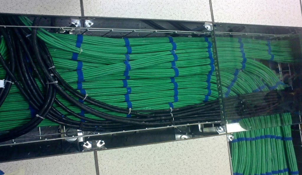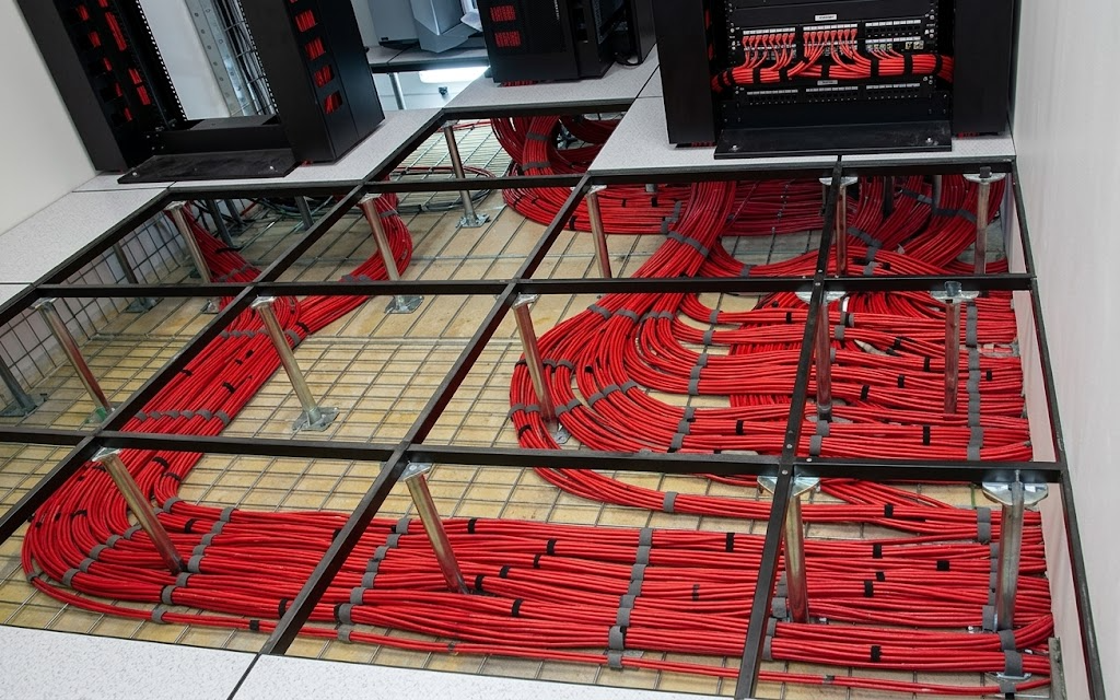 Cabos organizados sob piso elevado. |