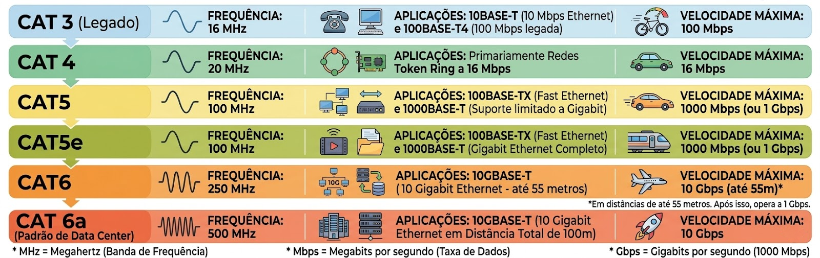 A única exceção é o CAT6 operando a 10 Gbps, que fica restrito a 55 metros.